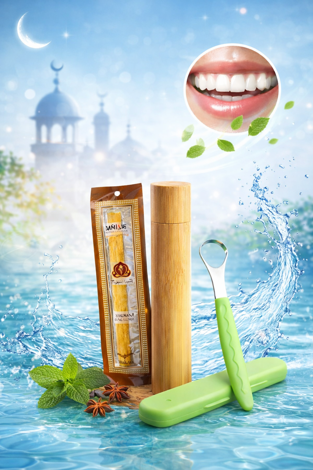 Dieses natürliche Mundpflege Set unterstützt dich im Ramadan bei der täglichen Hygiene. Miswak, Bambus Case und Zungenschaber sorgen gemeinsam für ein sauberes Mundgefühl und spürbare Frische, ganz ohne Chemie.